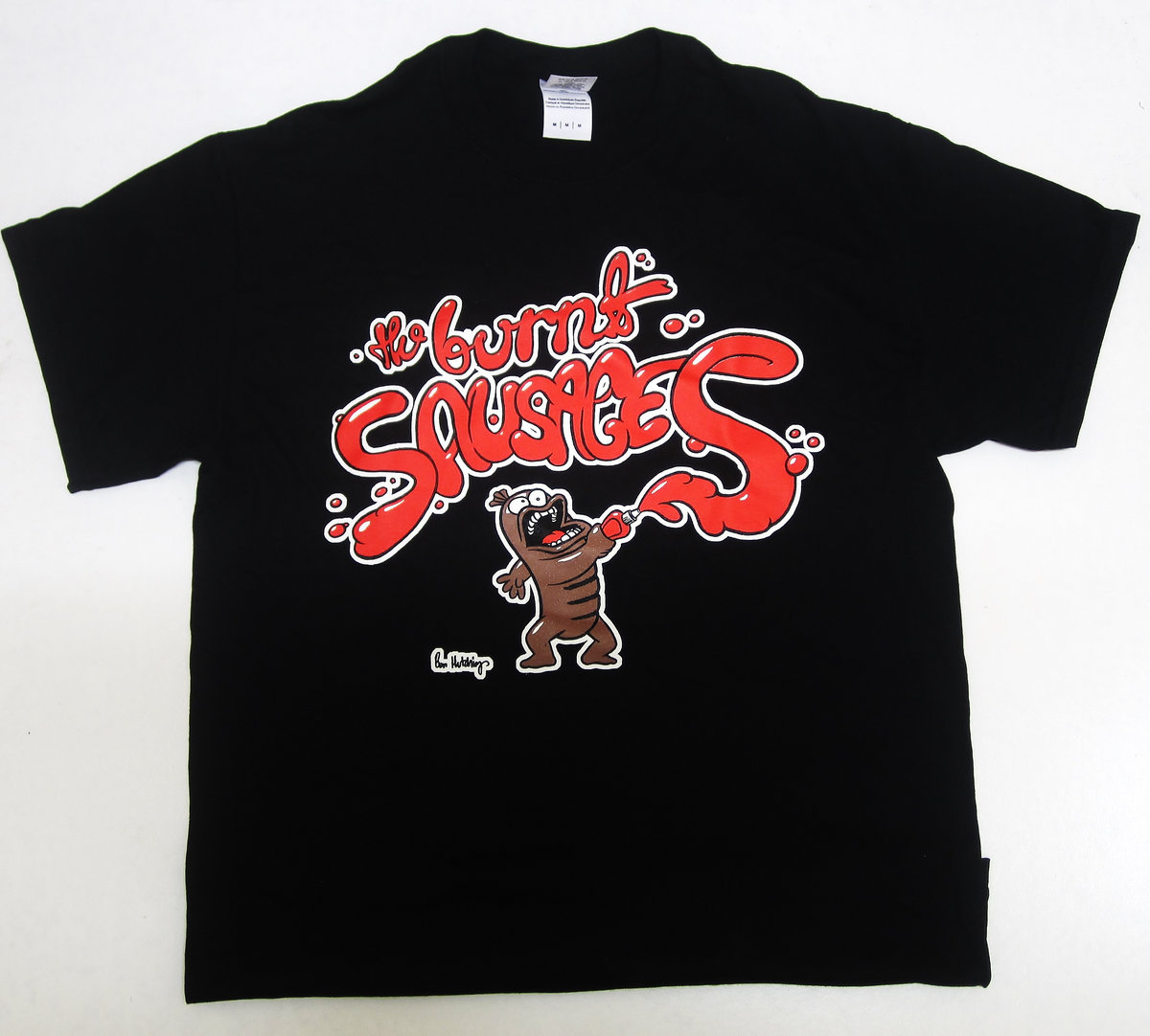 Sizzling Burnt Sausages Black T-shirt with saucetastic design by Ben Hutchings of Squishface Studios. Screenprinted in Melbourne at Too Far Gone.